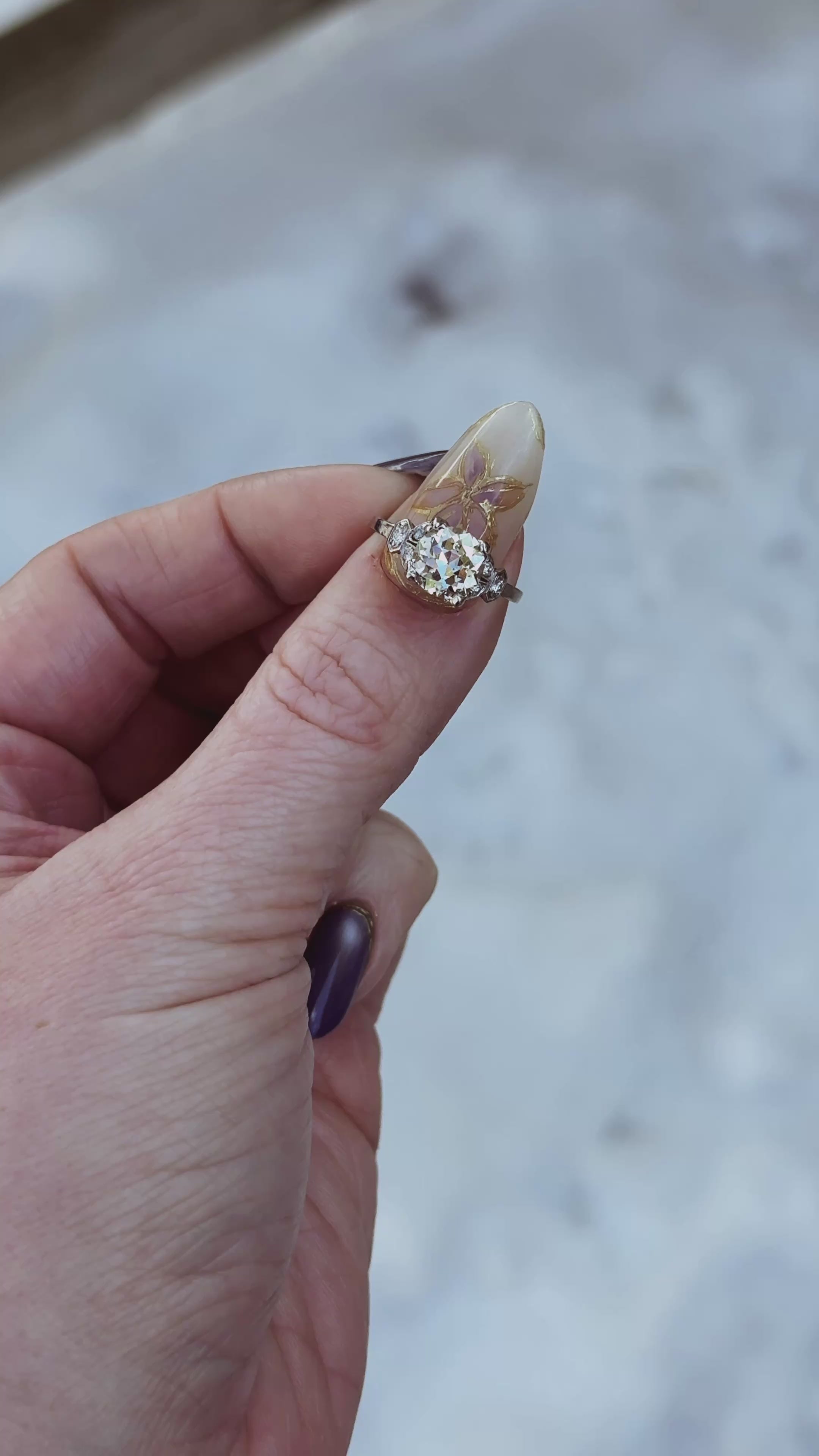 This ring doesn't commit fully to either era's orthodoxy; it exists in the tension between them. We're drawn to that refusal to resolve cleanly, the way strict geometric discipline coexists with those apologetic little leaves. It's honest about its moment in history, made during wartime, when platinum was restricted and designs had to justify every gram of metal, every deliberate choice. The transitional cut center stone matters here; it's not trying to be something it isn't. In a market obsessed with categorization, there's something quietly radical about a piece that simply says "I'm from 1940-something" and refuses to perform as anything else.